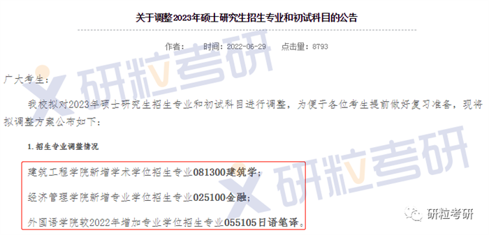 以下是研粒教育跨考考研为您整理考研资料:之前小研给大家整理过3所院校官宣新增硕士点将会在2023年开始招生,分别是北京工商大学、青岛科技大学、大连海洋大学。其实截止目前,已经有很多院校都官宣了新增招生专业,这对考研的你们来说是个好消息:首次招生,报考人数可能没有那么卷,竞争相对会小一些,或许是个上岸的“捷径”。一起看看,有没有你的理想院校!