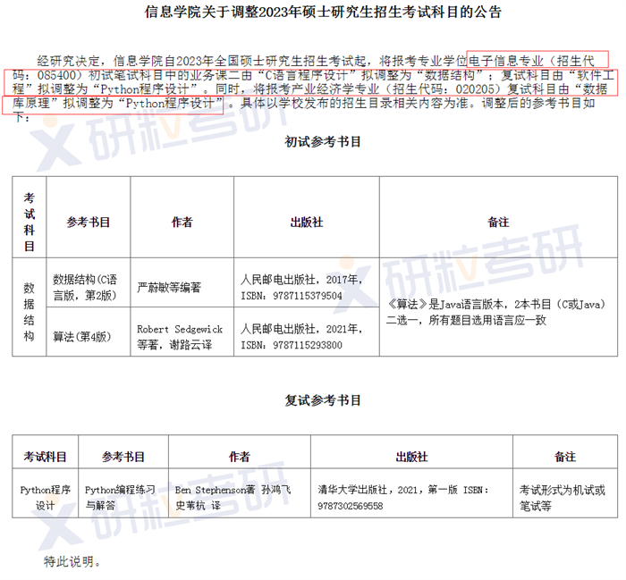 央财信息学院2023年专业学位085400电子信息专业初试笔试科目中的业务课二由“C语言程序设计”拟调整为“数据结构”;复试科目由“软件工程”拟调整为“Python程序设计”。同时,将报考020205产业经济学专业复试科目由“数据库原理”拟调整为“Python程序设计”。