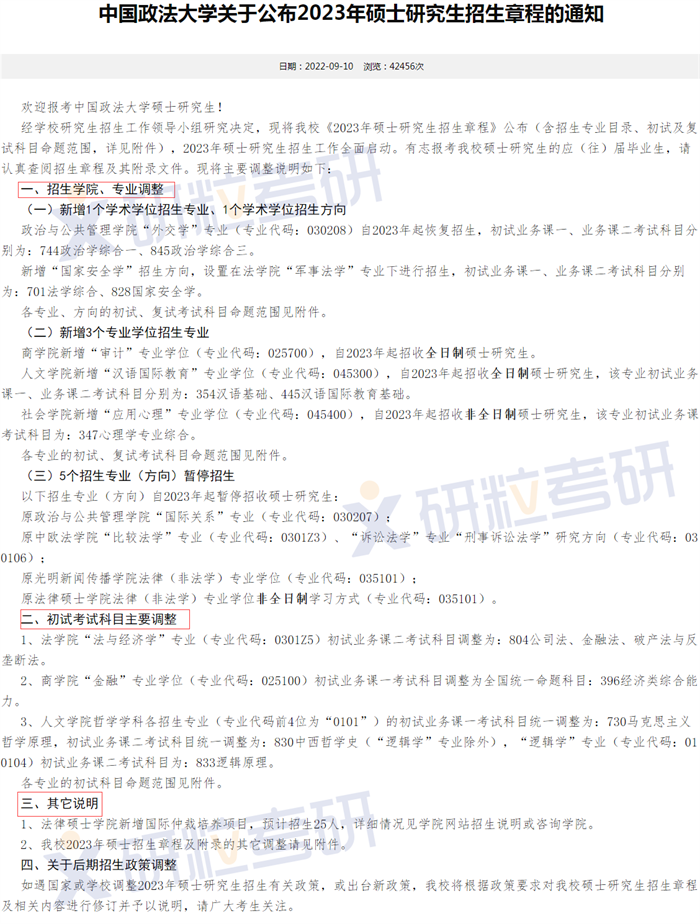 中国政法大学公布了2023年硕士研究生招生章程,新增、停招、调整多个专业,具体如下: