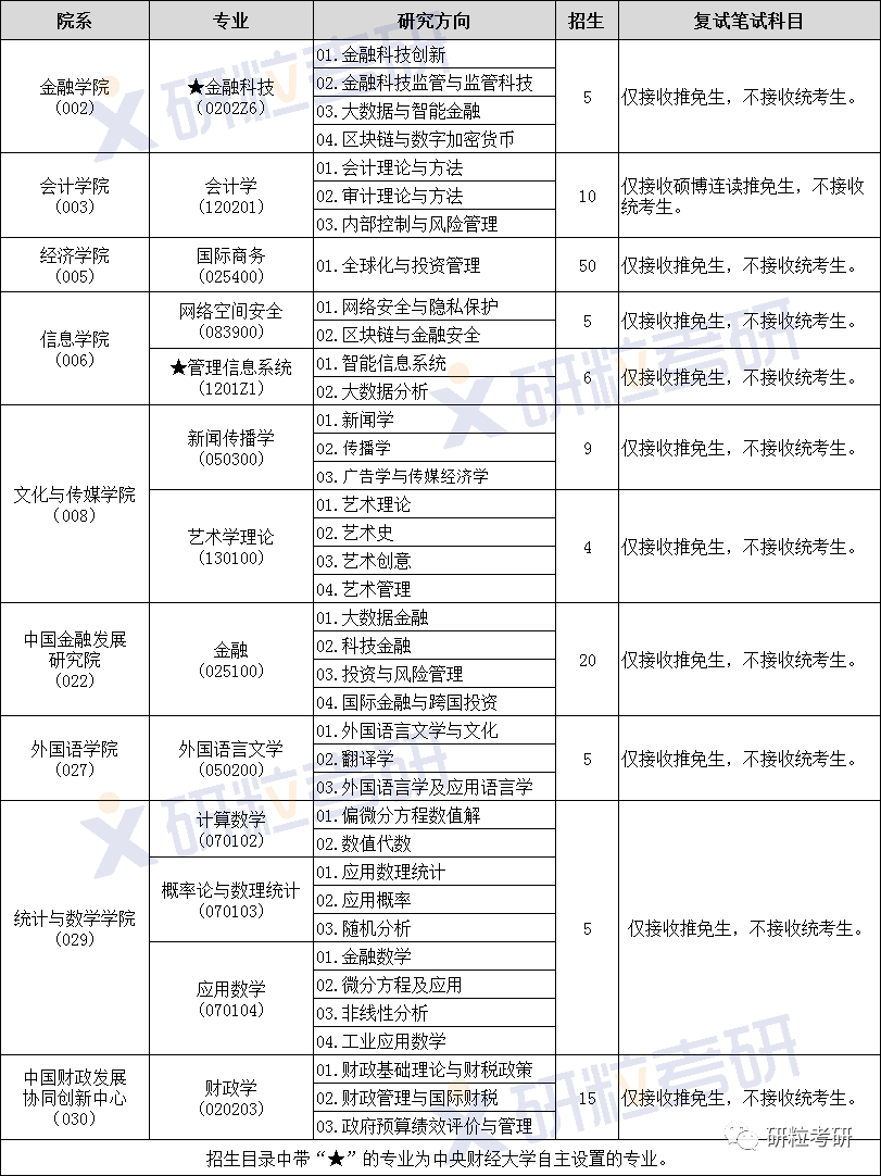 中央财经大学2023年硕士研究生招生专业目录中显示,国际商务、网络空间安全、管理信息系统、新闻传播学等13个专业仅招收推免生,不接收统考生。