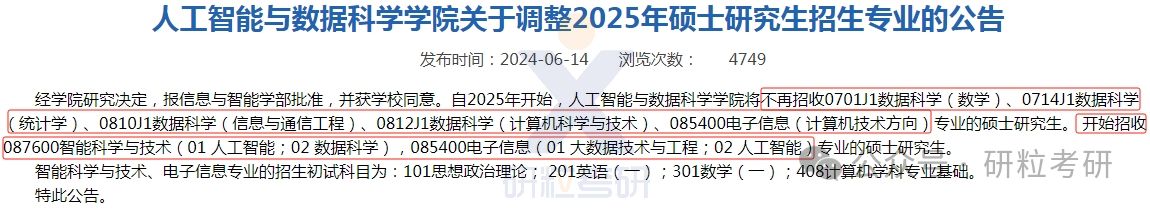 2.人工智能与数据科学学院2025年起,不再招收0701J1数据科学(数学)、0714J1数据科学(统计学)、0810J1数据科学(信息与通信工程)、0812J1数据科学(计算机科学与技术)、085400电子信息(计算机技术方向)专业的硕士研究生。开始招收087600智能科学与技术(01 人工智能;02 数据科学),085400电子信息(01 大数据技术与工程;02 人工智能)专业的硕士研究生。