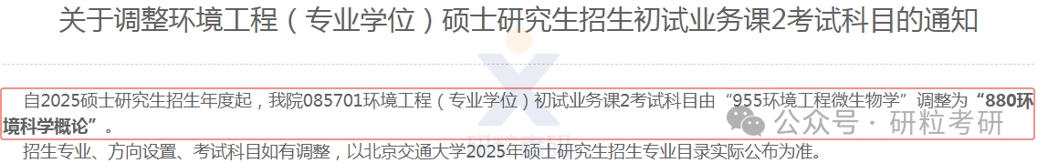 085701环境工程专硕初试业务课2考试科目由955环境工程微生物学调整为880环境科学概论。
