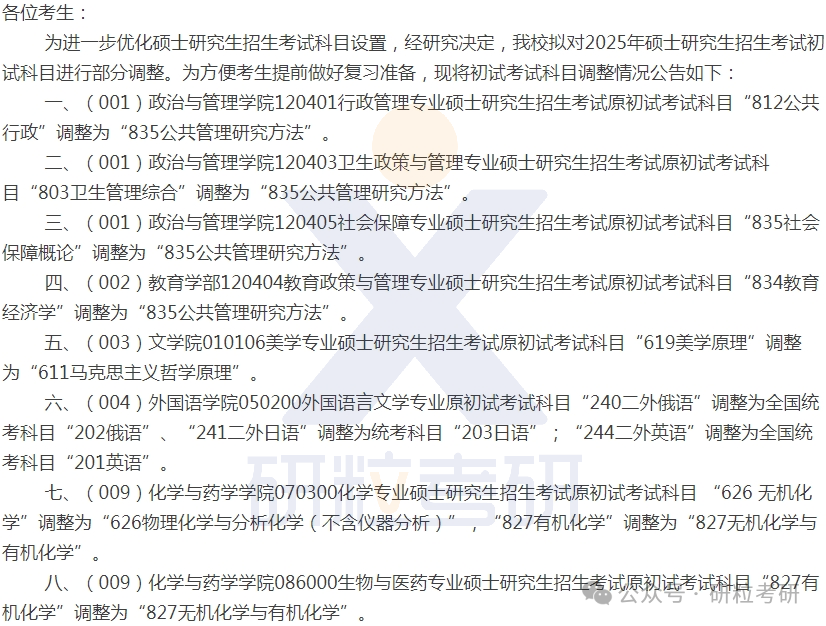 政治与管理学院、教育学部、文学院、外国语学院、化学与药学学院部分专业初试科目调整。